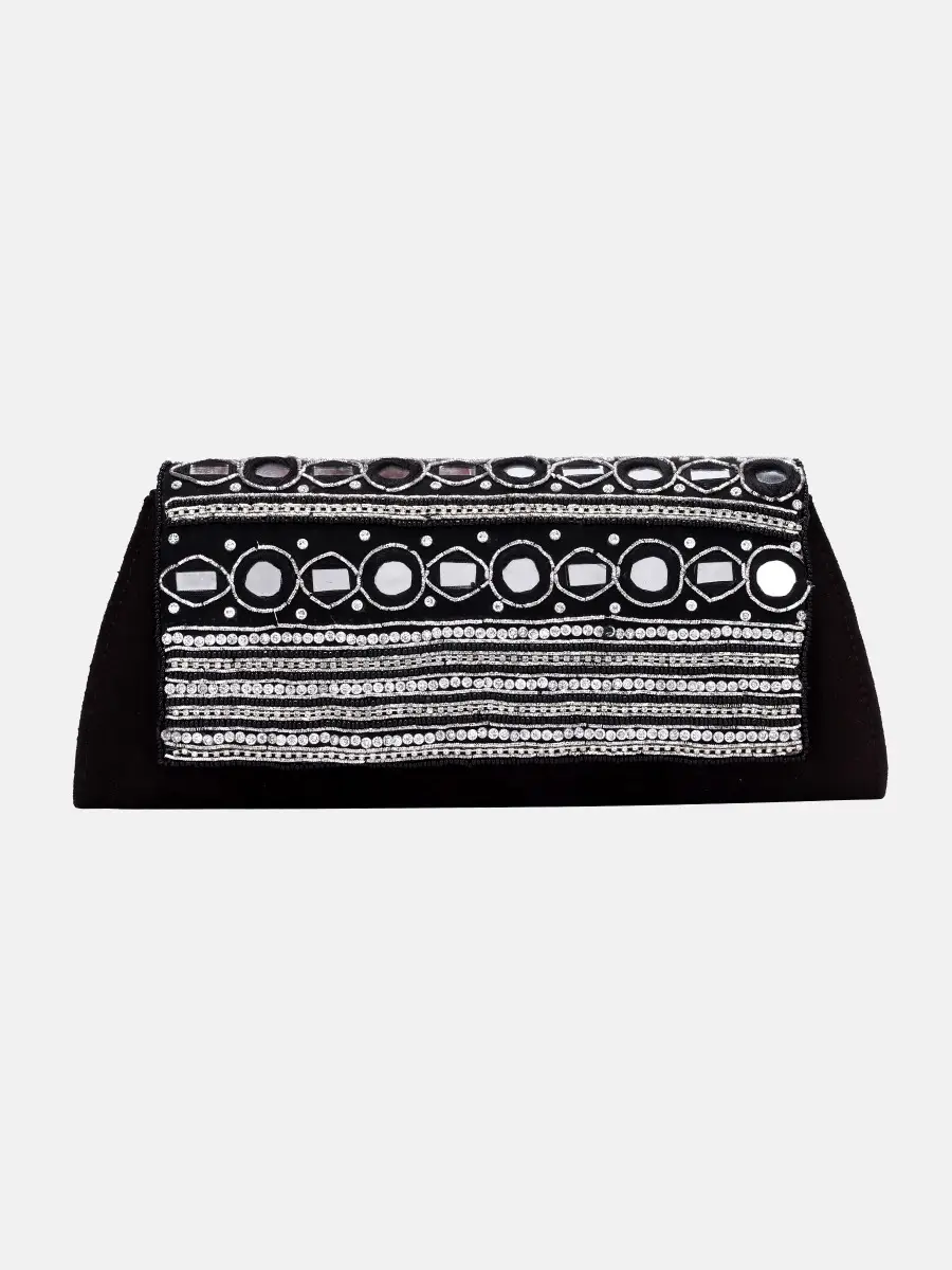 Black suede leather purse with gabardine lining, embroidery on magnetic closure flap. Embroidery work is completed with glass, beads and stone.