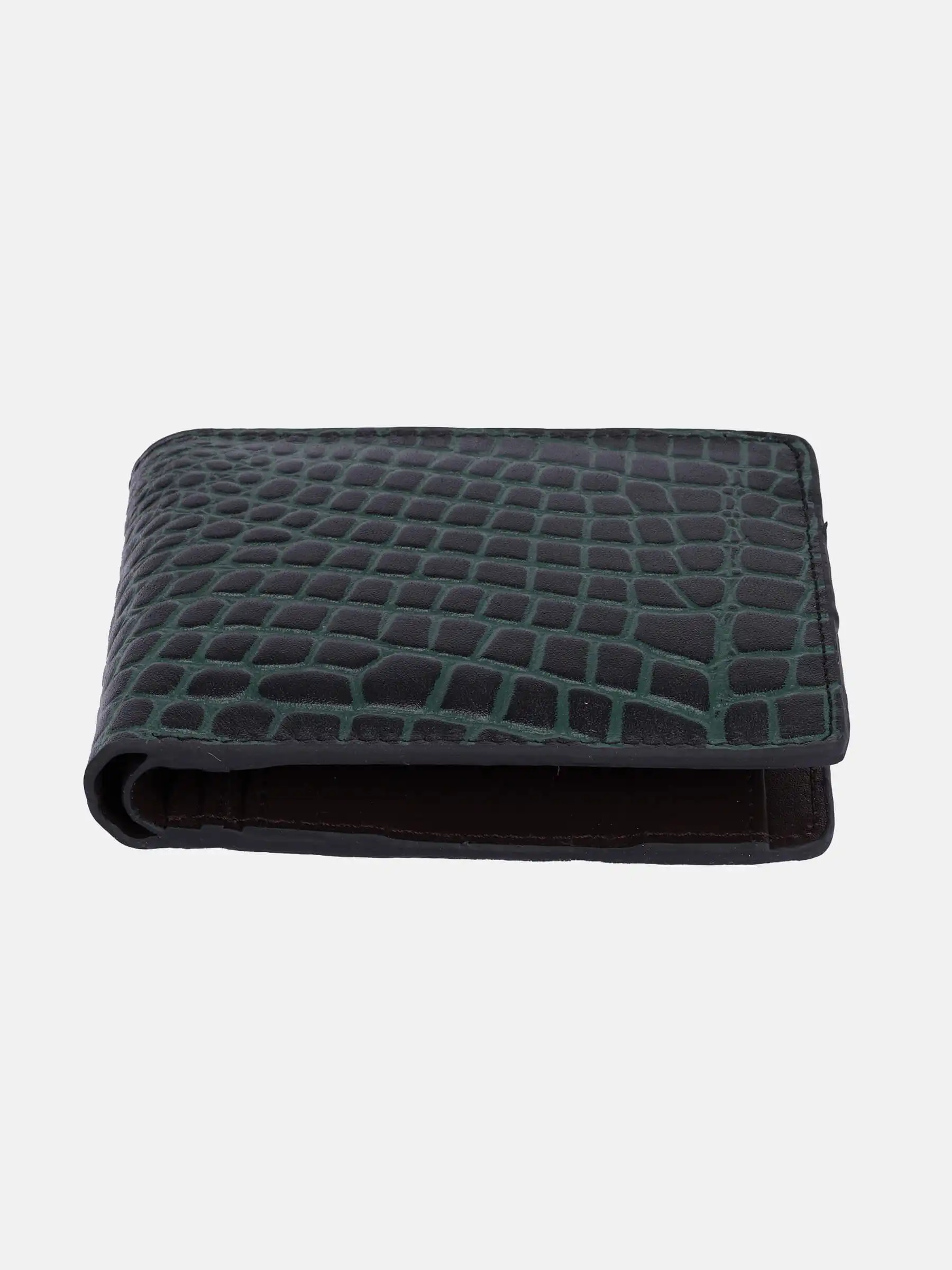 Green and black embossed leather wallet. Comes with multiple chambers to organize essentials.